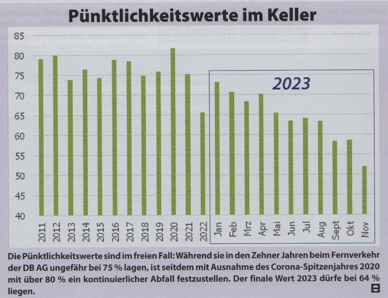 Doch das aktuelle Hauptproblem der Bahn im Fernverkehr kann nicht erst in 20 Jahren, sondern muss kurzfristig gelöst werden. Zumal das dramatische Absinken der Pünktlichkeit innerhalb der letzten Jahre nicht einfach durch Netzüberlastung begründet werden kann. Eine umfassende Analyse zur Pünktlichkeitsstatistik kann man in der jüngsten Ausgabe des Fachmagazins Bahn-Report (Nr. 1/2024) nachlesen. Der Autor Felix Berschin verweist auf viele hausgemachte Probleme der Bahn. Diese sind eine Mischung aus organisatorischen Probleme und aufgestauten Defiziten in der Instandhaltung von Schienennetz und Fuhrpark. Auch Baustellen taugen nach Meinung des Autors kaum als Ausrede.