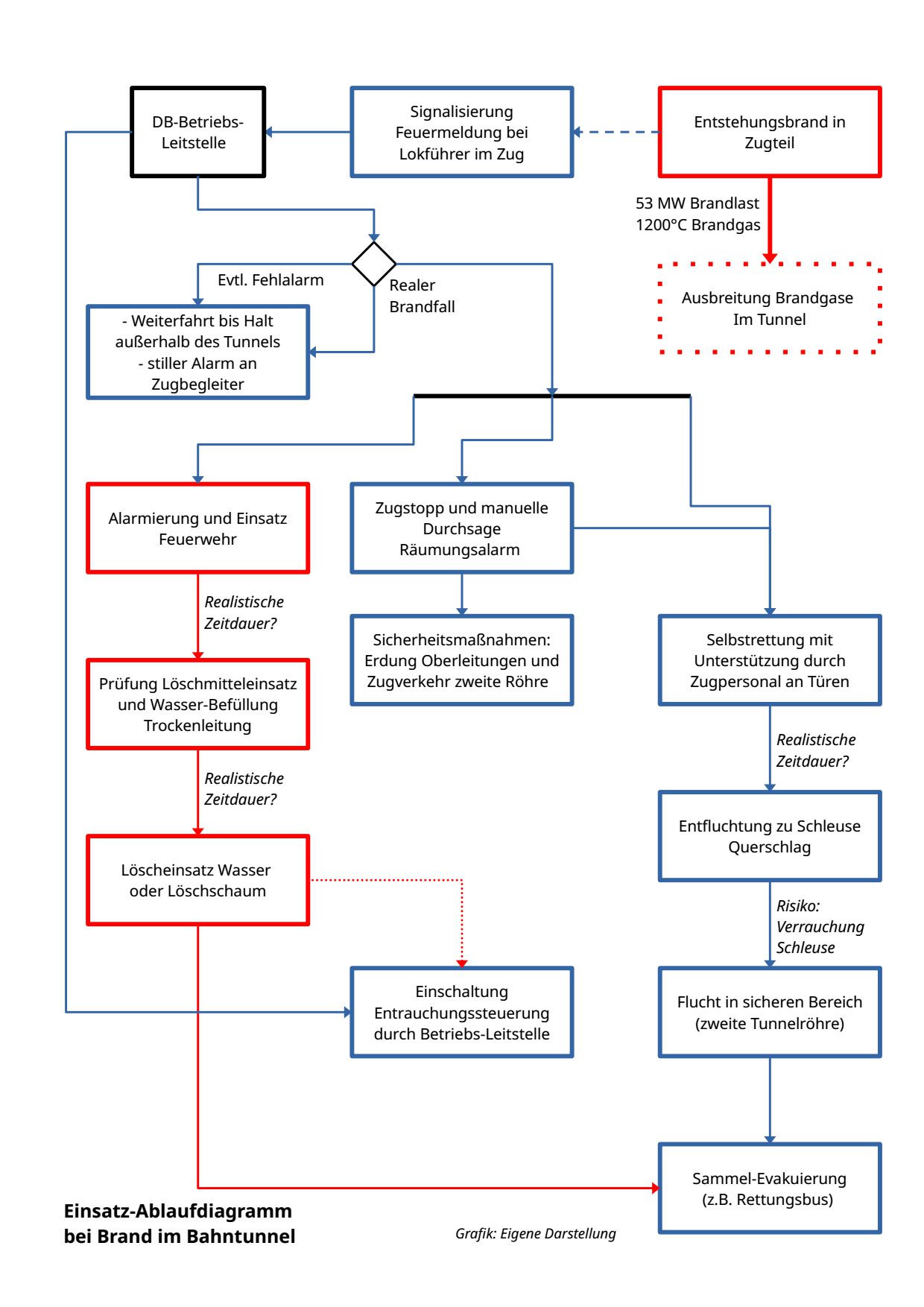 Dem Rettungskonzept der DB-Studie (auf Basis des o.g. DB-Bemessungsbrandes) liegt die Annahme zugrunde, es handele sich um einen erst in der „Entstehung“ befindlichen Anfangs-Brand mit nur geringer Rauchfreisetzung, die die Selbstrettung der Zuginsassen nicht weiter beeinträchtigt. Begründet wird dies mit der kurzen Fahrzeit des Zuges im Tunnel, während der sich ein Brand noch nicht sehr weit entwickelt haben könne. Verwiesen wird darauf, dass ein in Brand geratener Zug nicht in den Tunnel einfahren darf. Als Brandbeginn wird somit erst die Einfahrt in den Tunnel zugrunde gelegt und daraus gefolgert, dass sich nach den wenigen Minuten Fahrzeit im Tunnel der Brand erst in der Entstehung befinde und die freigesetzte Brandlast sowie die Rauchfreisetzung noch sehr gering sind.