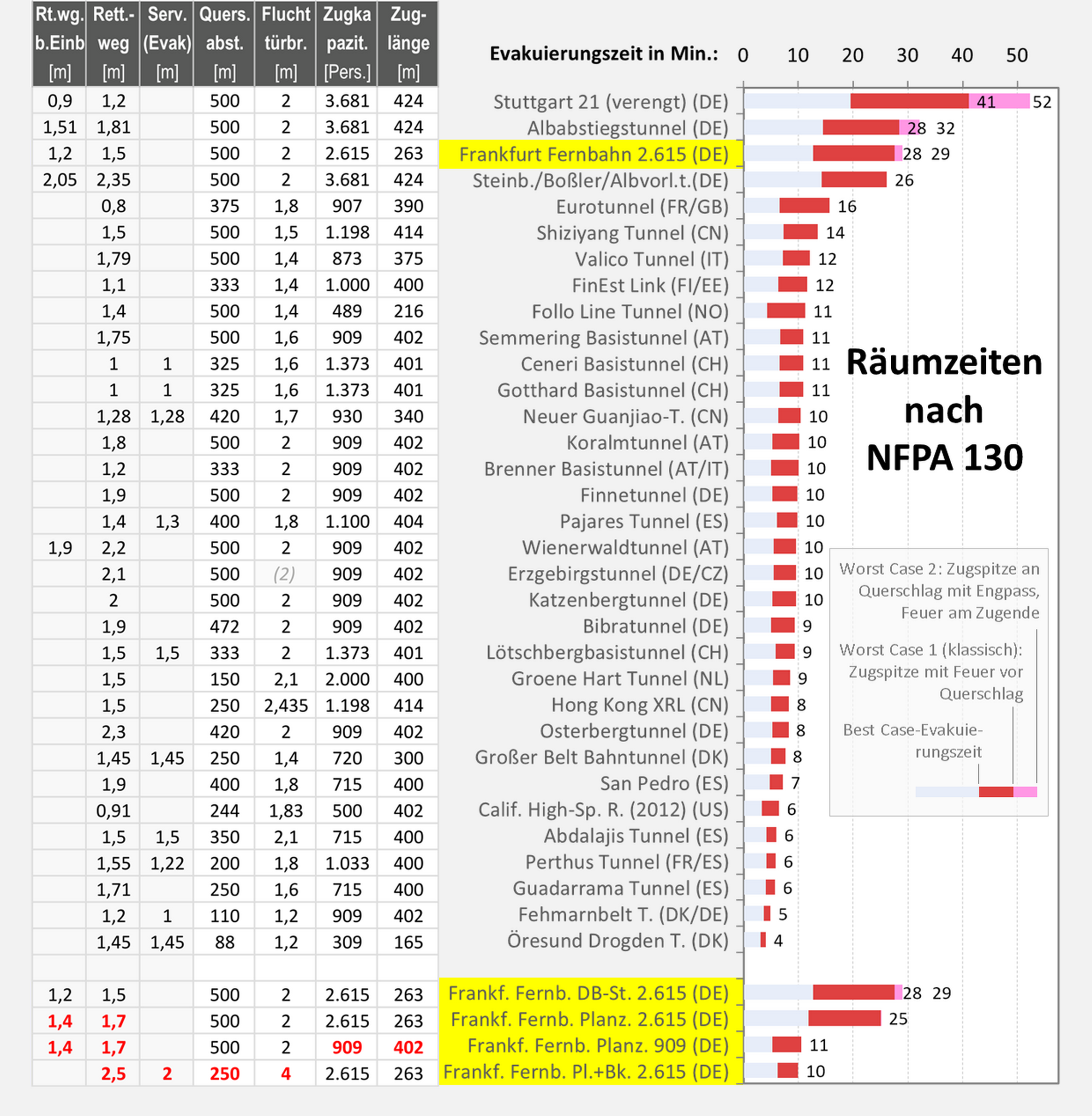 Vergleich internationaler Doppelröhrentunnel in der Räumzeit nach NFPA 130. Links Grundparameter: Rettungswegbreite verengt, normal, zweiter Rettungsweg, Querschlagabstand, Fluchttürbreite, Personenkapazität/Zug, Zuglänge (Fluchttürbreite Erzgebirgstunnel geschätzt). Rechts: Resultierende Räumzeit nach NFPA im „Best Case“ sowie im klassischen „Worst Case 1“ und dem „Worst Case 2“ im Falle eines Engpasses vor dem Rettungsstollen. Unten Szenarien für den Fernbahntunnel Frankfurt.