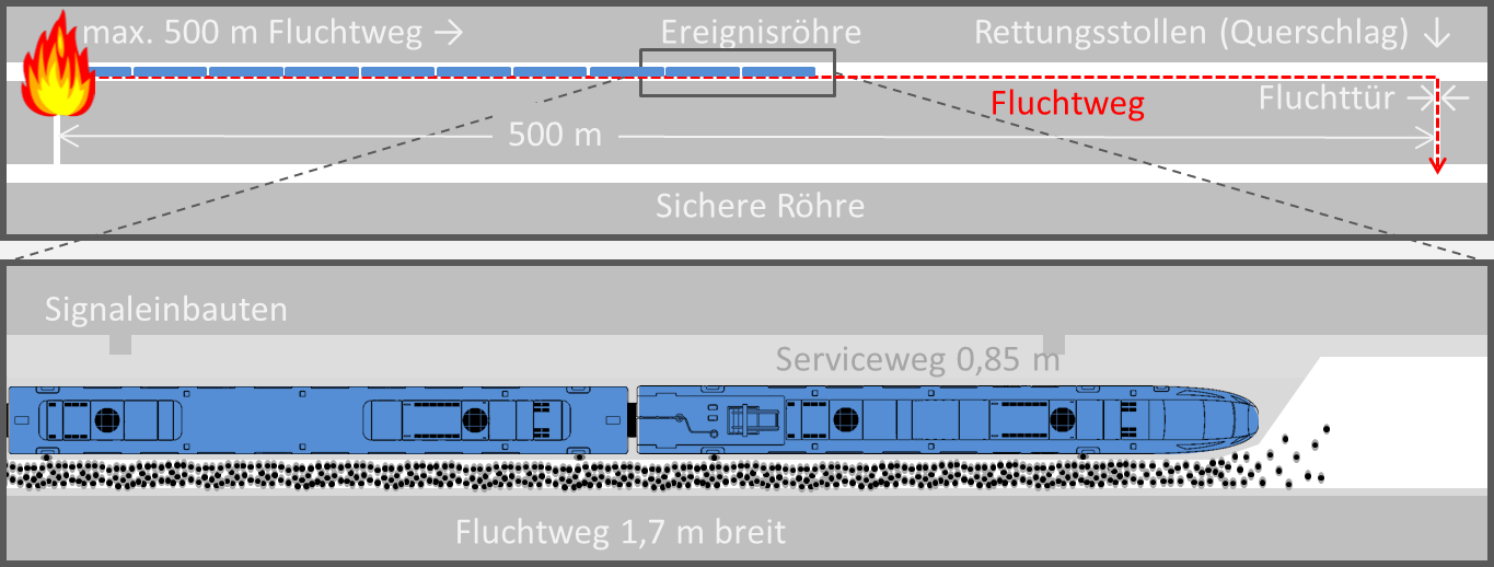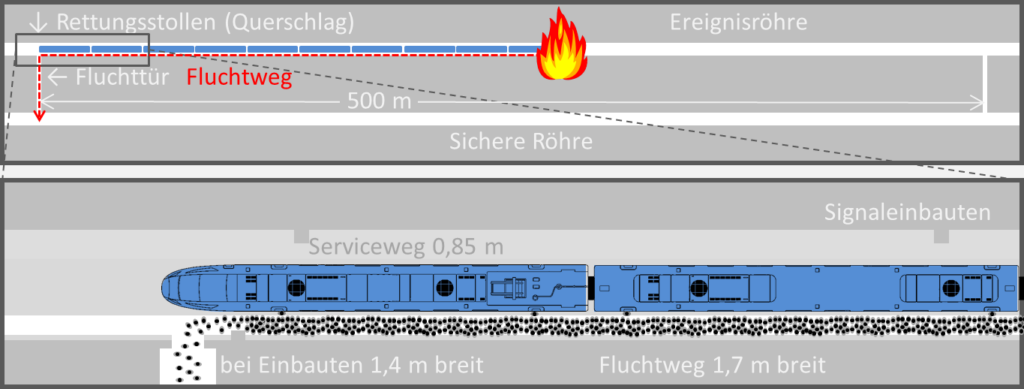 Für den Fall eines Nothalts im Tunnel muss eine realistische Zeitdauer der Evakuierungsmaßnahmen bis zur Rettung der Insassen (einschließlich mobilitätseingeschränkter Personen) in einen sicheren Bereich kalkuliert werden.