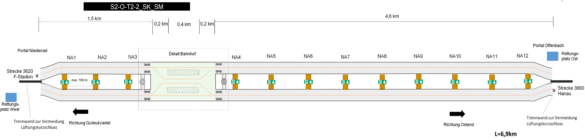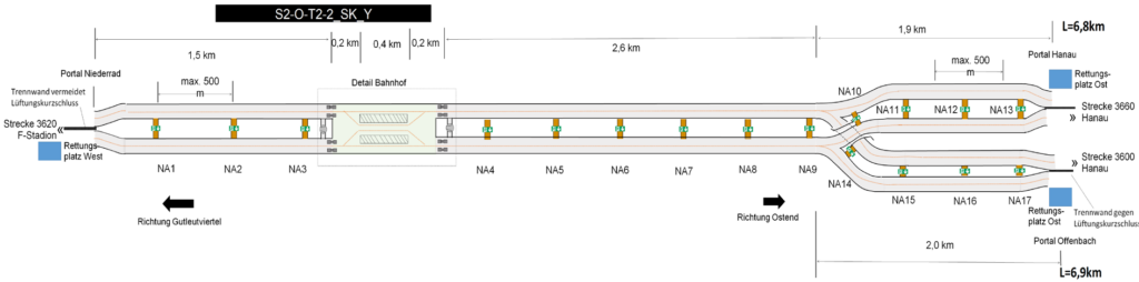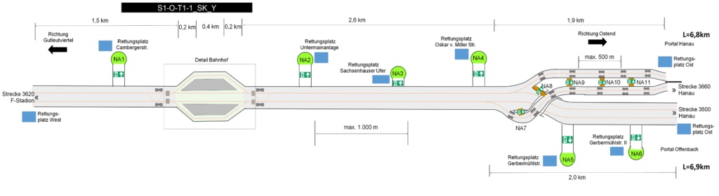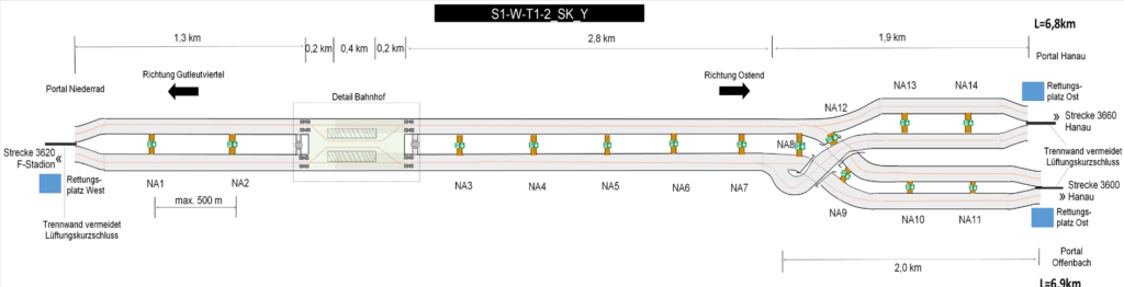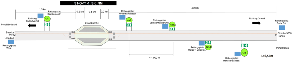 Rettungsschächte an die Oberfläche ermöglichen kurze Rettungswege ggf. anstelle von Querschlägen, was jedoch in der Frankfurter Innenstadt schwer realisierbar ist.