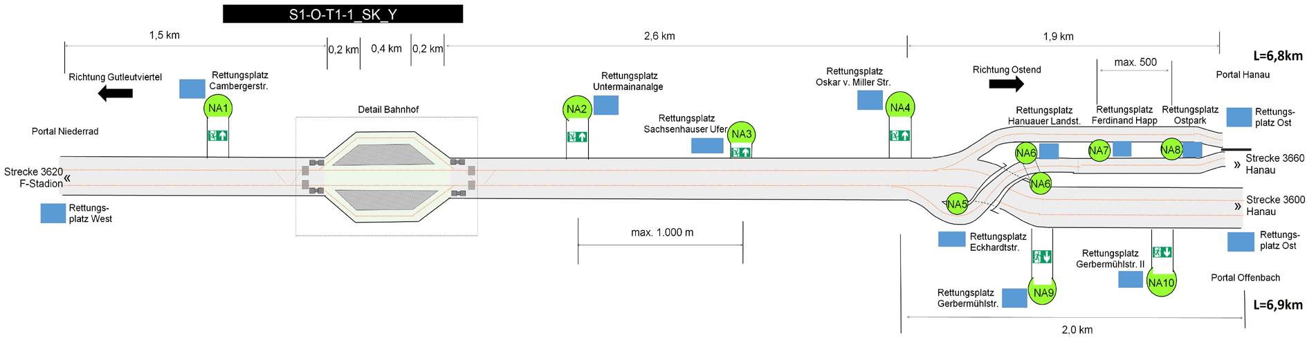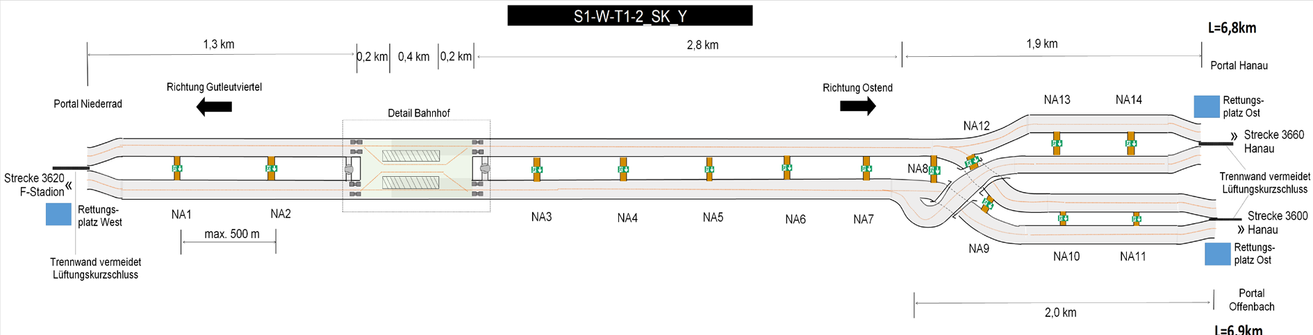 | 5. und 6. zwei eingleisige, parallele Tunnelröhren mit Y- Trasse im Osten, beide Äste ebenso als eingleisige Tunnel |