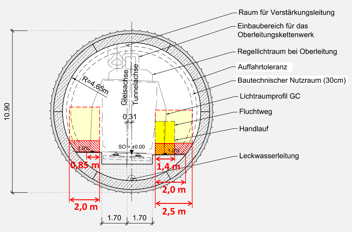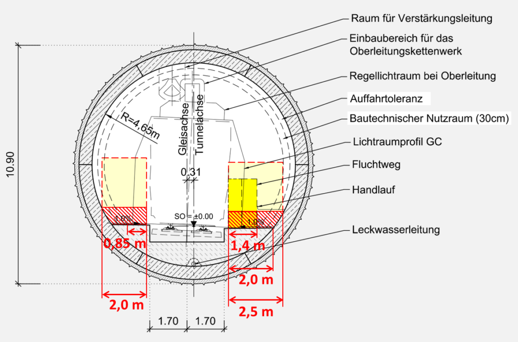 Die nachfolgende Planzeichnung aus der DB-Studie wurde für die Wiedergabe hier mit Vermaßungen und Schattierungen versehen. Sie zeigt gelb hinterlegt den schmalen Rettungsweg. Es ist nicht zu verantworten, dass in den ohnehin engen Doppelröhrentunneln auch noch der Rettungsweg durch unnötig große Toleranzen, Einbauten und teils sogar durch den Handlauf künstlich verengt werden. Hier ließe sich mit geringen Mitteln viel für die Sicherheit im Evakuierungsfall gewinnen. Die Auffahrttoleranz erscheint ungewöhnlich groß und sollte verringert werden können. Die Installationen der Löschwasserhydranten und Notrufsäulen nutzen idealerweise die Ausbauchung der Tunnelröhre. So könnte eine hindernisfreie Rettungswegbreite von 2 m nutzbar gemacht werden.