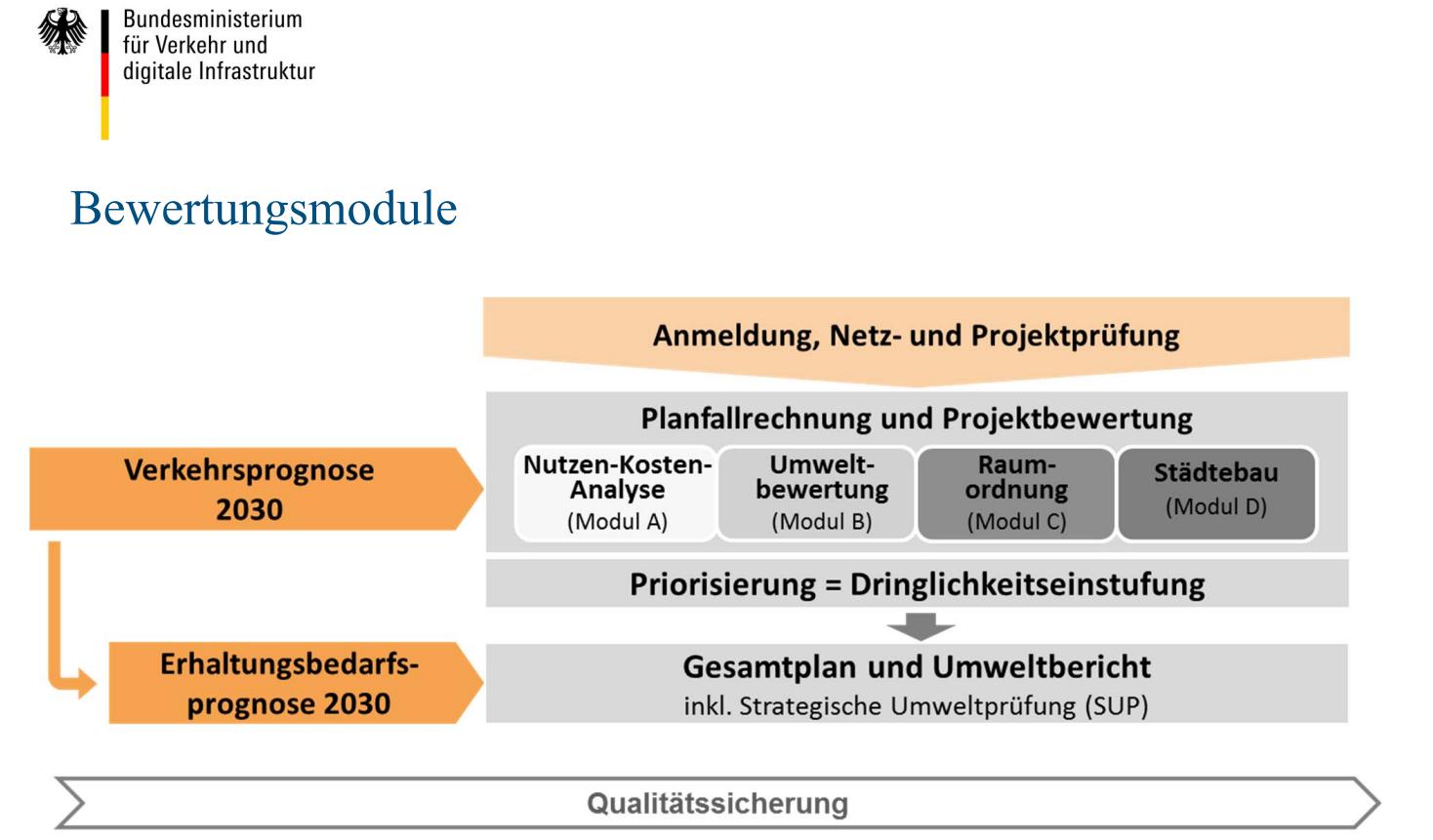 Jedem Bahnprojekt, das über den Bundesverkehrswegeplan (BVWG) des Bundesministeriums für Digitales und Verkehr (BMDV) angeschoben wird, geht eine Bewertung voraus. Diese erfolgt nach einem standardisierten Verfahren als Nutzen-Kosten-Untersuchung (NKU) mit Fokus auf eine Nutzen-Kosten-Analyse (siehe dazu die beiden Folien). Im Ergebnis wird diese mit dem Faktor Nutzen-Kosten-Verhältnis (NKV) zusammen gefasst. Als prinzipiell sinnvoll und notwendig werden seitens de BMDV nur solche Projekte angesehen, bei denen dieser Faktor über 1 liegt.