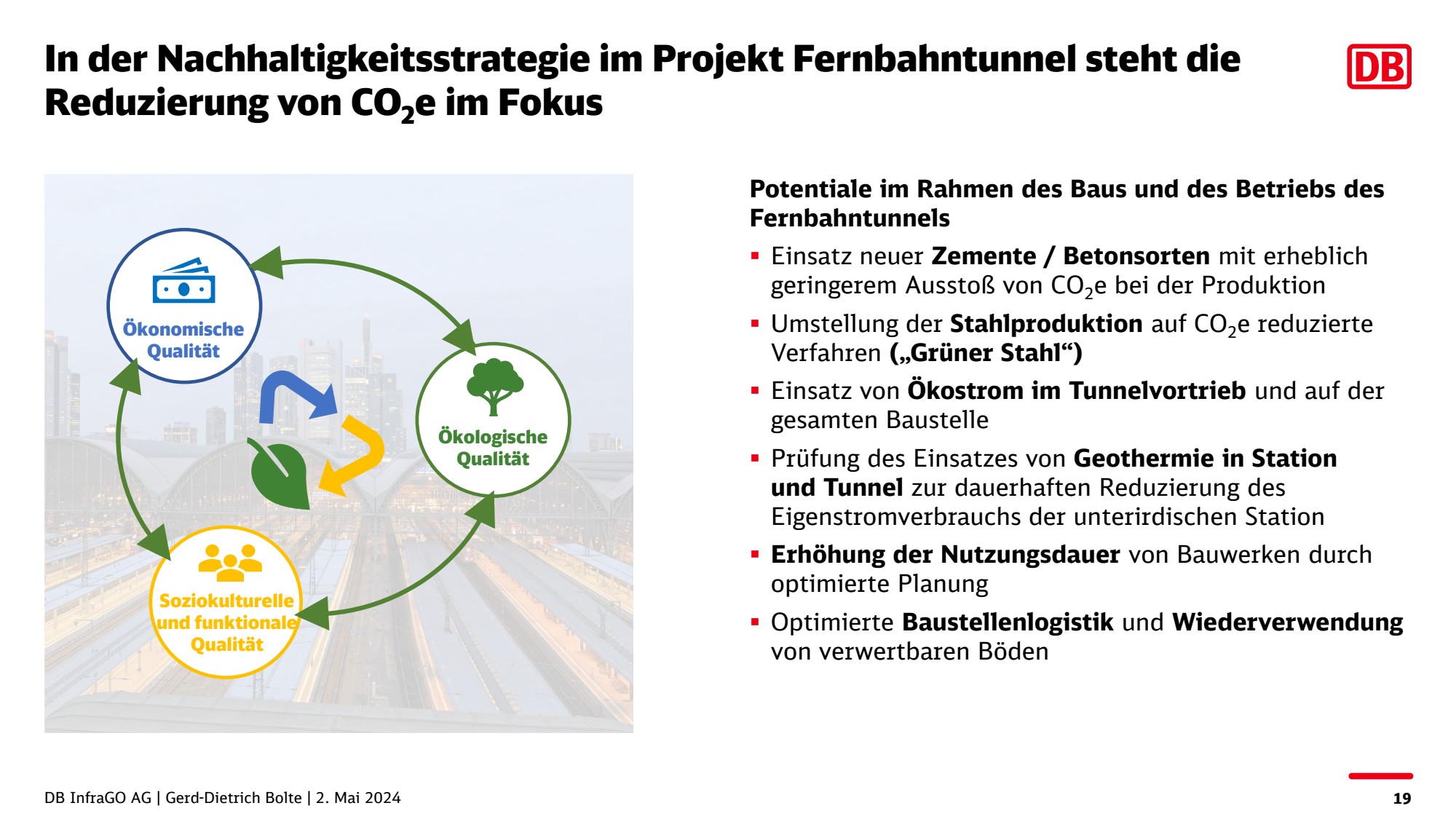 Laut volkswirtschaftlicher Nutzen-Kosten-Analyse des Fernbahntunnels Frankfurt plus der weiteren betrachteten Frankfurter Projekte werden 45.216 Tonnen CO2 pro Jahr eingespart. Die nordmainische S-Bahn umfasst ungefähr ein Drittel der Gesamtprojektkosten. Geht man davon aus, dass auch 1/3 des Nutzens auf dieses Projekt fällt, so werden durch den Fernbahntunnel Frankfurt rund 30.000 Tonnen CO2 pro Jahr durch den Betrieb eingespart. Bei einer Gesamtmenge von CO2-Emissionen von 800.000 t muss somit der Fernbahntunnel 800.000 / 30.000 = 27 Jahre betrieben werden, bis das durch den Bau emittierte CO2 durch die Verlagerung vom Pkw- auf den Schienenverkehr wieder eingespart ist.“