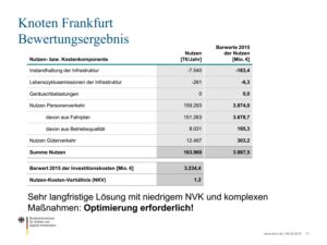 Bezug: Vortragsfolien von Alexander Lanz, Referat E 13 vom 8.2.2019, beinhaltend die Darstellung des Ausbauumfangs für den Knoten Frankfurt (Folie 16) und das NKV-Bewertungsergebnis (Folie 17).“ [3]