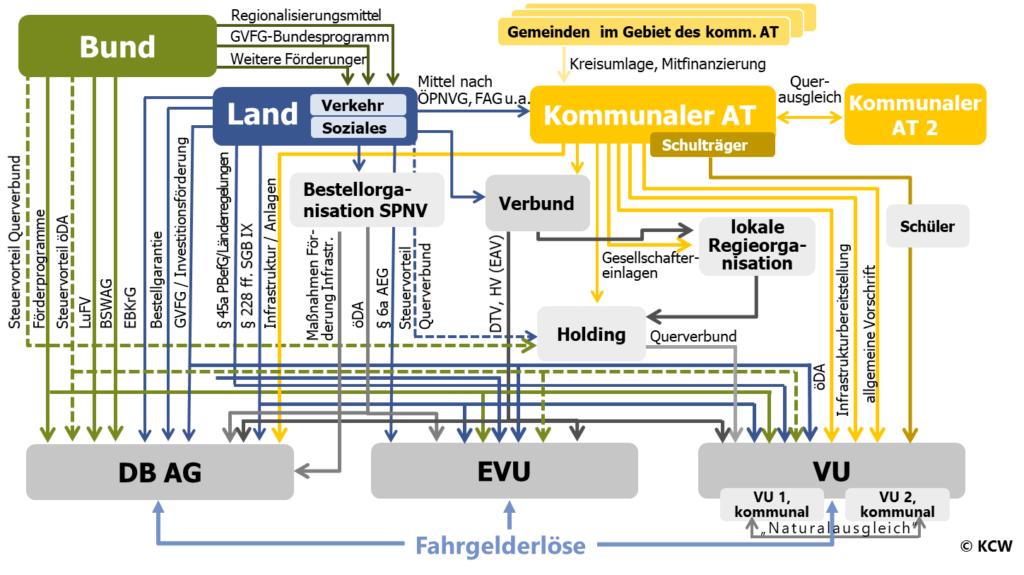 In der Fachwelt hat sich [gegenüber der obigen Prinzipdarstellung – Abb. 51 der UBA-Studie] ein zweites Bild etabliert, die sogenannte Spaghetti-Grafik,da diese deutlich detaillierter die einzelnen Finanzierungsquellen sowie deren Adressaten ausweist. Sie stellt die verschiedenen Akteure und die jeweiligen Finanzierungsströme zueinander dar. Ungeachtet ihrer Komplexität kann auch die Spaghetti-Grafik nicht alle Besonderheiten der ÖPNV-Finanzierung abbilden, insbesondere ergeben sich in den einzelnen Bundesländern differenzierte Darstellungen.