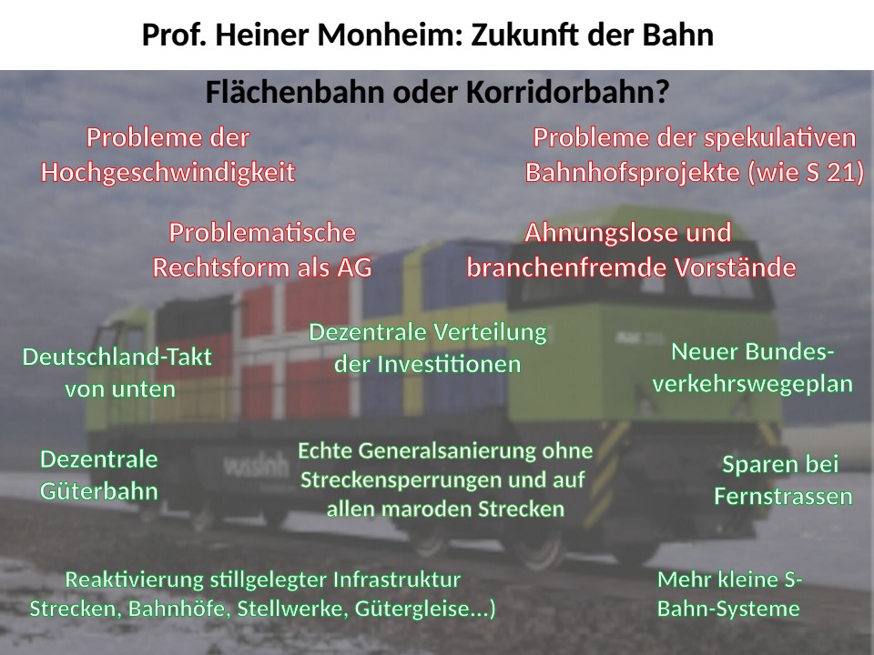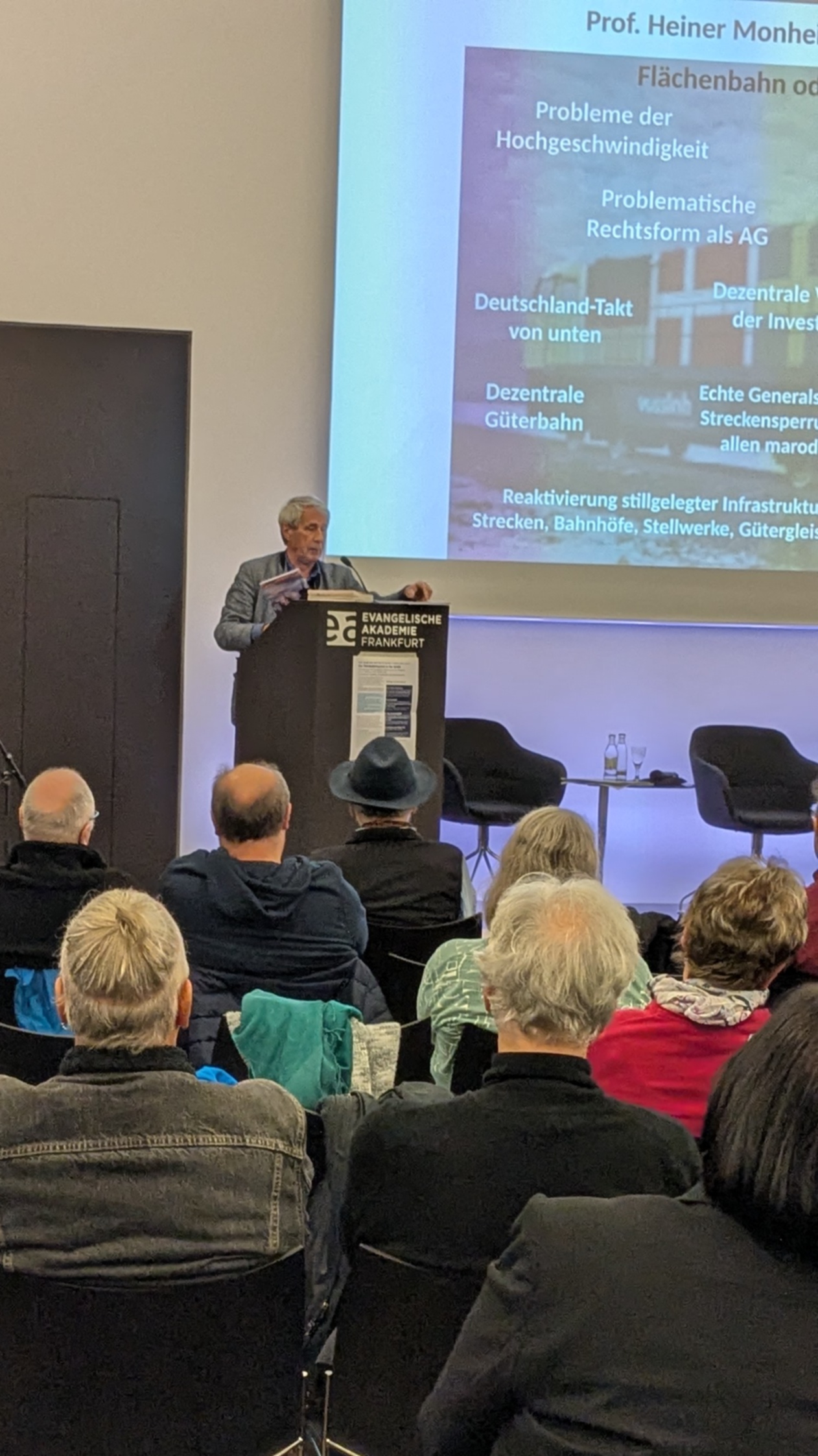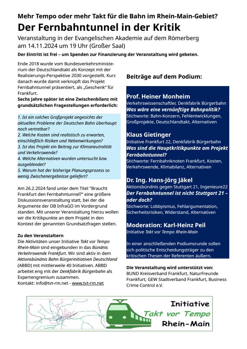 Am Donnerstag, den 14.11. um 19 Uhr findet in der Evangelischen Akademie auf dem Römerberg um 19 Uhr eine Veranstaltung statt, bei der ausgewiesene Experten das Projekt Fernbahntunnel kritisch beleuchten. Im Unterschied zu früheren Veranstaltungen geht es dabei weniger um Detailfragen, sondern um den bundespolitischen Kontext mit Erfahrungen aus bisherigen Megaprojekten und vernünftigen Alternativen. Dazu wird Prof. Heiner Monheim als Verkehrswissenschaftler darstellen, wie eine solche Bahnpolitik aussehen müsste und welche Rolle Großprojekte bei bisherigen Fehlentwicklungen spielen. Klaus Gietinger (Initiative Frankfurt22) weist seit Jahren auf Alternativen zum Fernbahntunnel hin und wird ein neu vorliegendes Fachkonzept vorstellen. Dr. Ing. Hans-Jörg Jäkel wird auf die umstrittene Frage eingehen, inwieweit das Projekt Fernbahntunnel mit Stuttgart21 vergleichbar ist. Organisiert und moderiert wird die Veranstaltung – bei der auch eine Video-Zuschaltung möglich ist – von der Initiative „Takt vor Tempo Rhein-Main“ in Zusammenarbeit mit dem BUND Kreisverband, den Naturfreunden Frankfurt, dem GEW Stadtverband und Business Crime Control e.V.